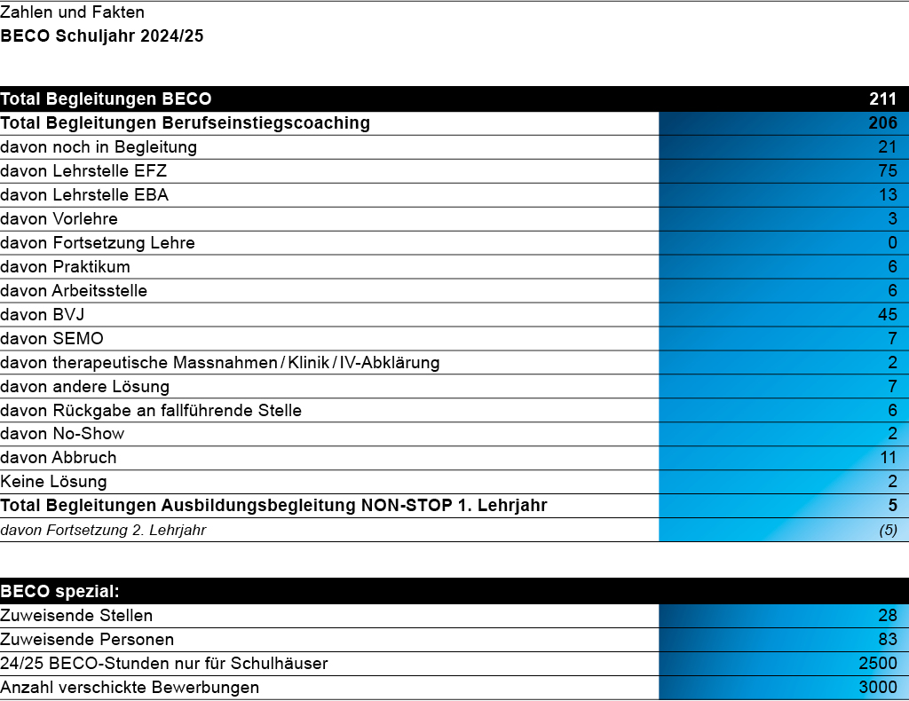 Im vergangenen Schuljahr durften wir in der Abteilung BECO 206 Teilnehmende beim Berufseinstieg begleiten. Das Ergebnis kann sich sehen lassen: 53 % der Jugendlichen fanden eine Anschlusslösung in Form einer Lehrstelle EBA, EFZ oder Vorlehre. Einige Jugendliche begleiteten wir in den Programmen NON-STOP und IAZH auch im 1. Lehrjahr.